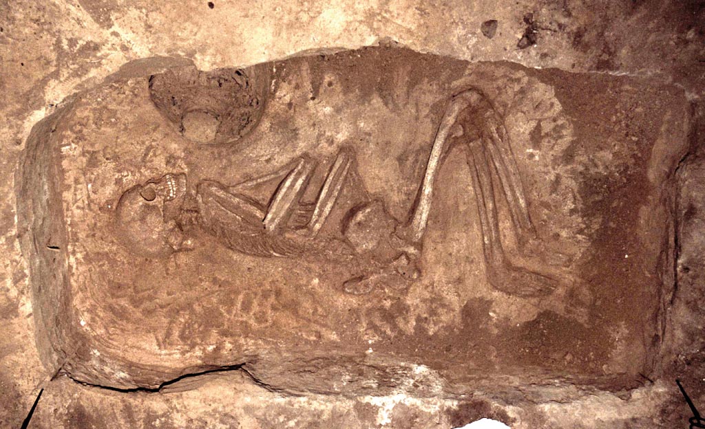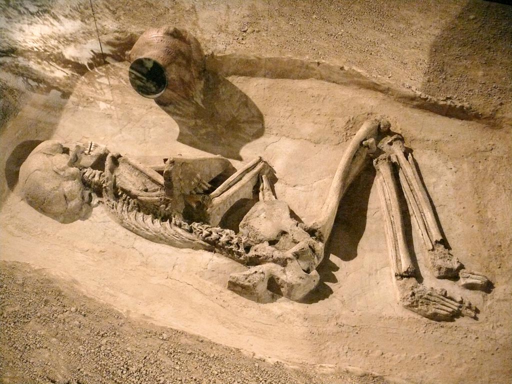 Solch eine typische Bestattung ist im Museum zu sehen. In der Ausstellung können Sie weitere Grabbeigaben aus jüngeren Epochen, darunter ein kreuzverziertes Gefäß aus dem 4. bis 6. Jahrhundert n. Chr., bewundern. Handelt es sich hier um bloße Zierde oder liegt ein frühes Zeugnis christlichen Einflusses vor?